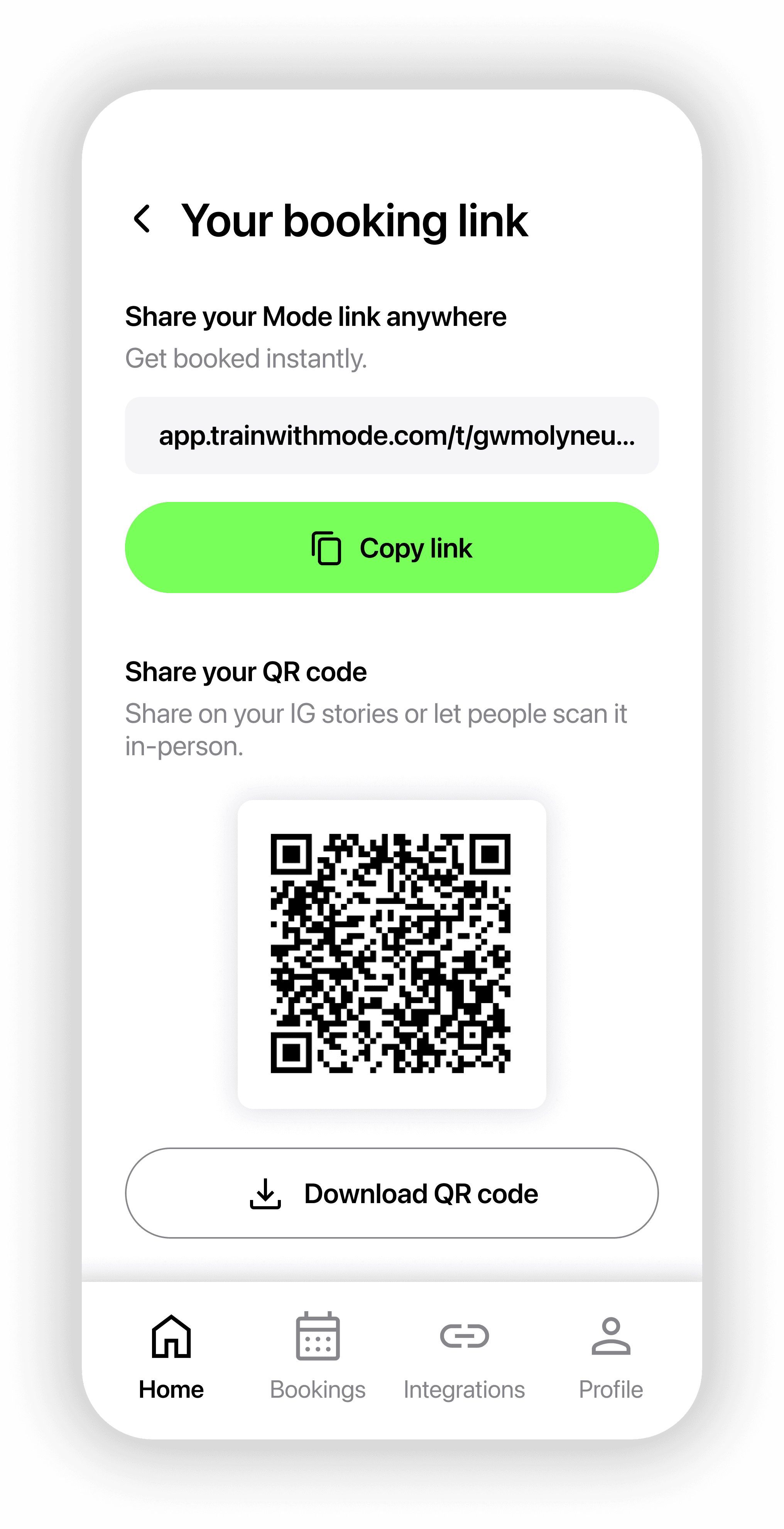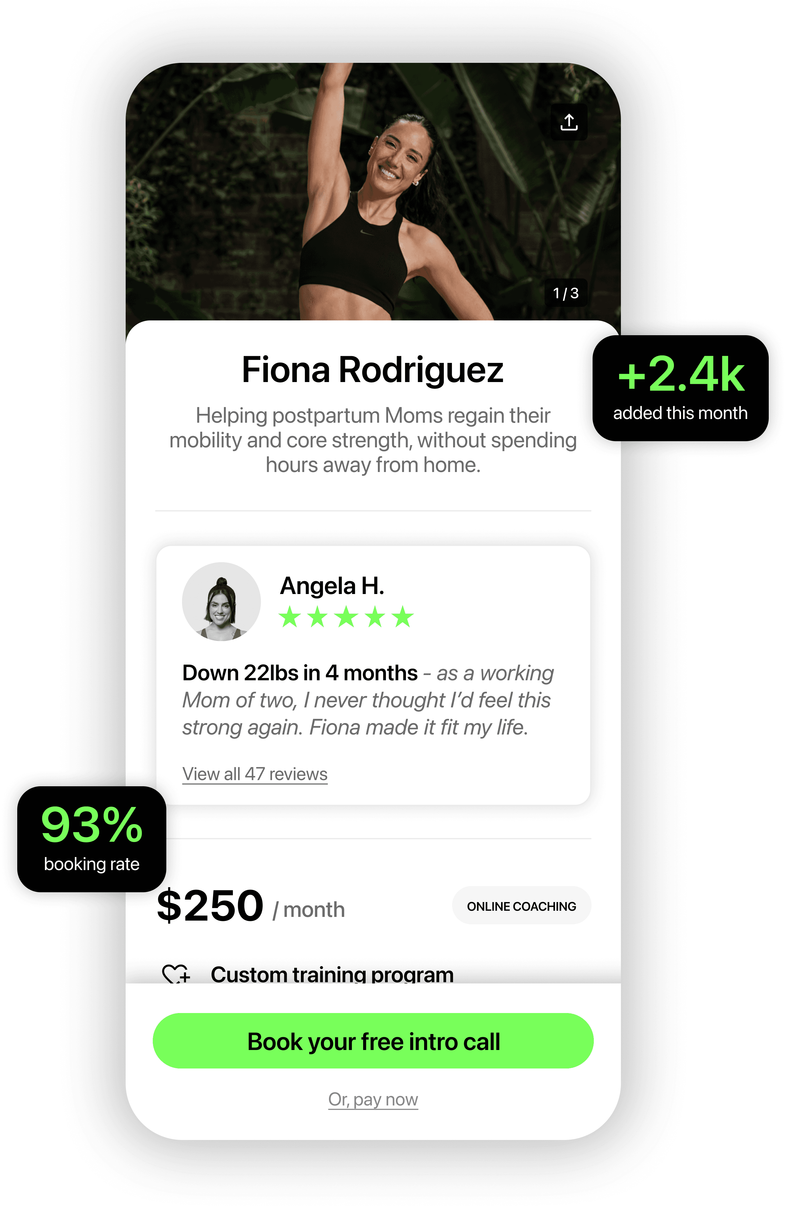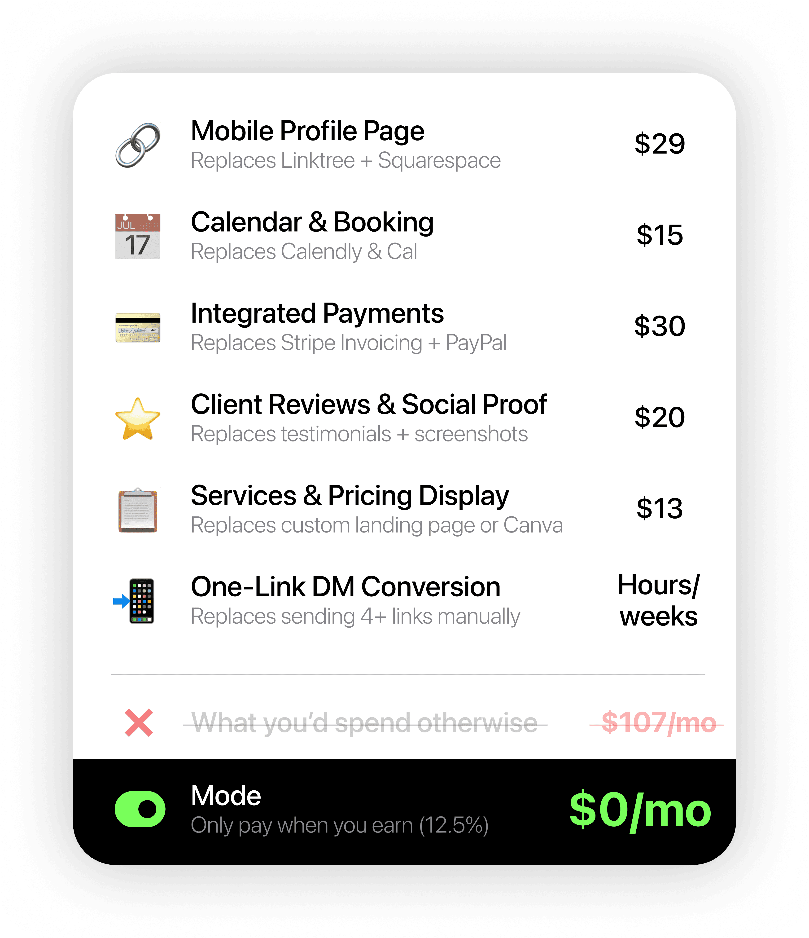Mode is a conversion tool built specifically for personal trainers. We give you a single link that combines your profile, pricing, testimonials, booking, and payments — so when a client clicks, they can book and pay in 30 seconds. No more chasing leads across five different apps.